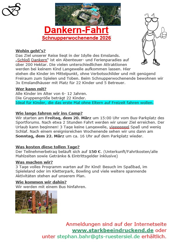 An unserer Schule findet in den Ferienzeiten ein Betreuungsangebot über die Fima Stark beeindruckend – Beeindruckend stark statt. Es werden vielseitige Aktivitäten angeboten, wie zum Beispiel ein Kreativ Camp, ein Sport und Tanz Camp, Übernachtungsangebote aber auch für Wissbegierige eine Entdeckertour rund um den Rüstersieler Hafen. An den Angeboten dürfen auch nicht Schüler*innen der GTS Rüstersiel teilnehmen.